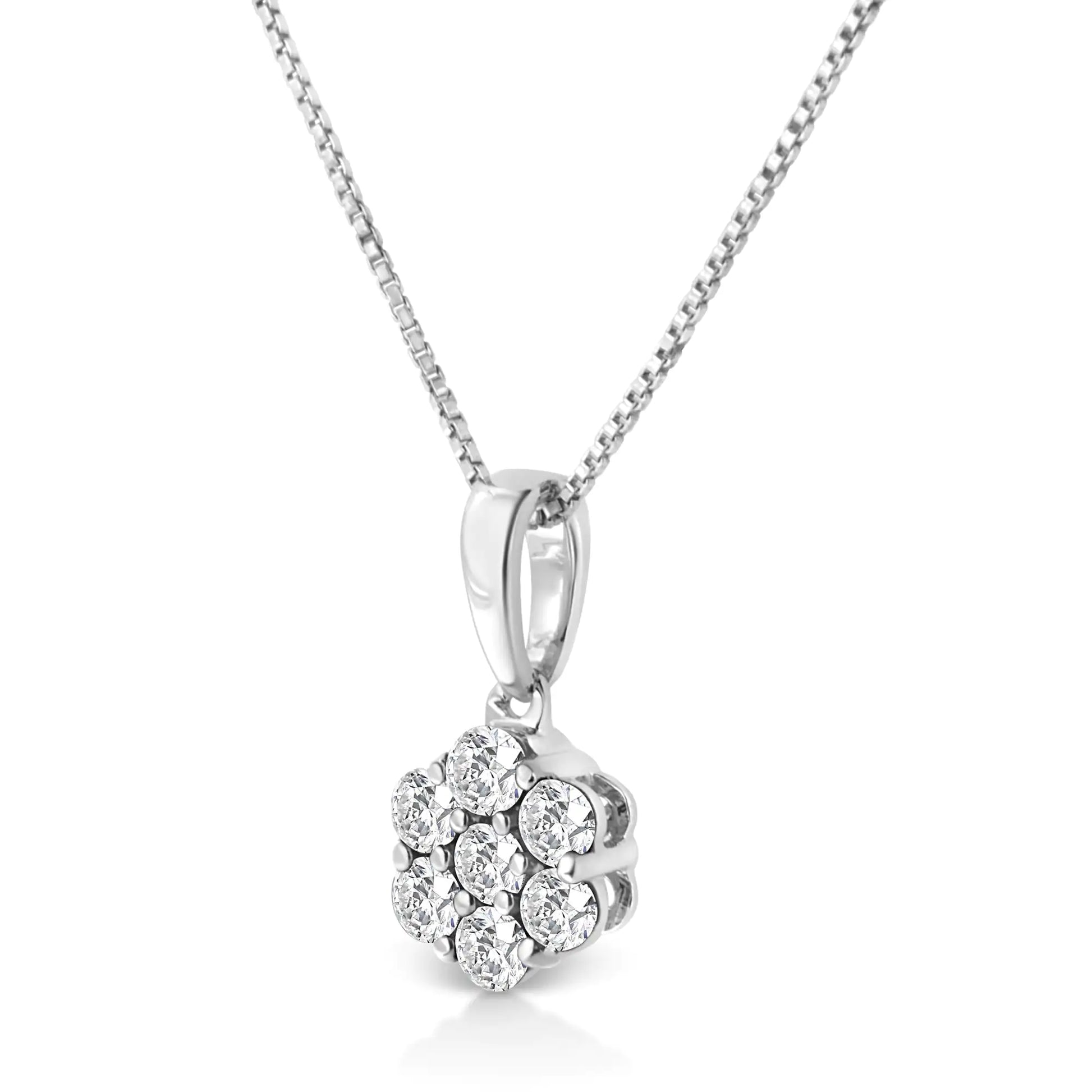This stunning floral cluster pendant is designed with 7, natural diamonds in a glistening prong setting. Designed in the finest 14k white gold, this necklace boasts 1/2 ct tdw. This is the perfect accessory for any night out.